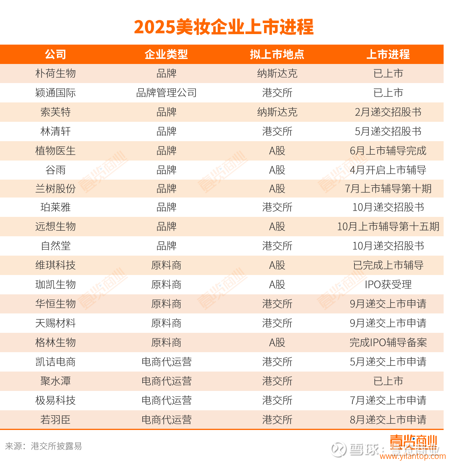 壹览商业统计发现,2025年以来,共有20家国货美妆相关企业启动上市进程,涵盖品牌方、原料供应商、电商代运营公司等多个类型。其中,约一半企业选择港交所作为主要申报地,其余则奔赴A股或美股市场。