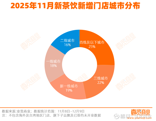 从新增门店的城市分布来看,新茶饮的门店增长重心在下沉市场,其中四线及以下城市11月新增806家门店,占当月新增门店的四分之一;三线城市表现同样强劲,新增693家门店,占比21.72%;二线城市新增占比最少,为15.39%。