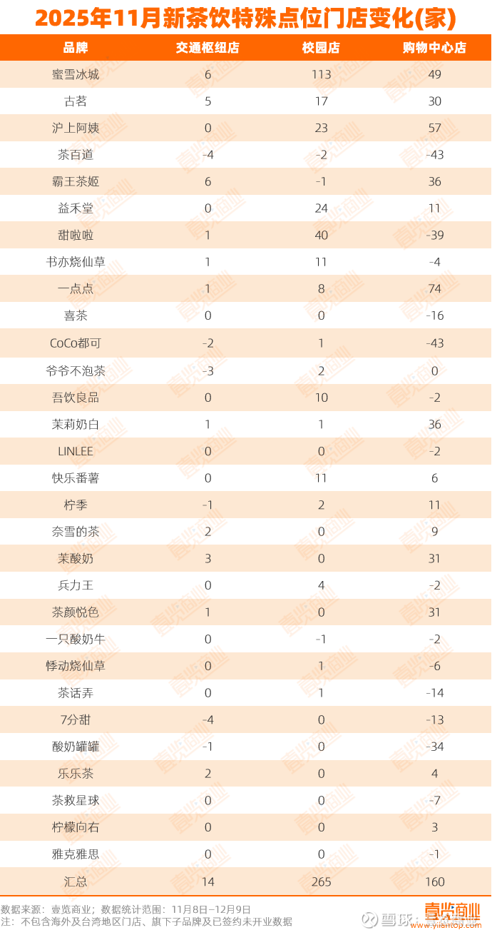 购物中心点位净增160家门店,一点点以净增74家门店位居该渠道首位,不过,当月也有一半的品牌从购物中心撤出部分门店,五分之一的品牌撤出超过10家门店。交通枢纽净增14家,在特殊点位中仅占比4%,品牌们对此处开店较为谨慎,仅11个品牌实现正增长。$蜜雪集团(02097)$ $古茗(01364)$ $茶百道(02555)$