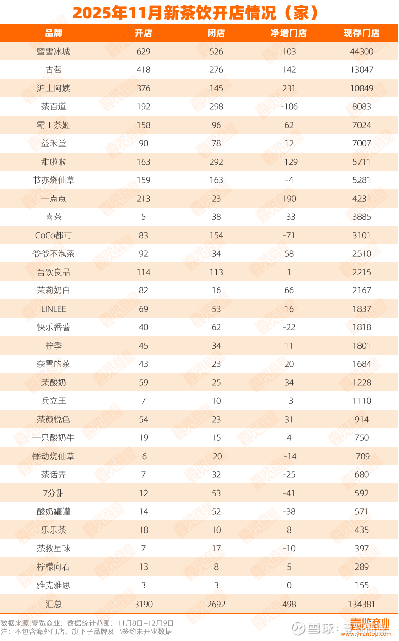 现有门店总量13.44万家,单月新开3190家、关闭2692家,净增长498家。