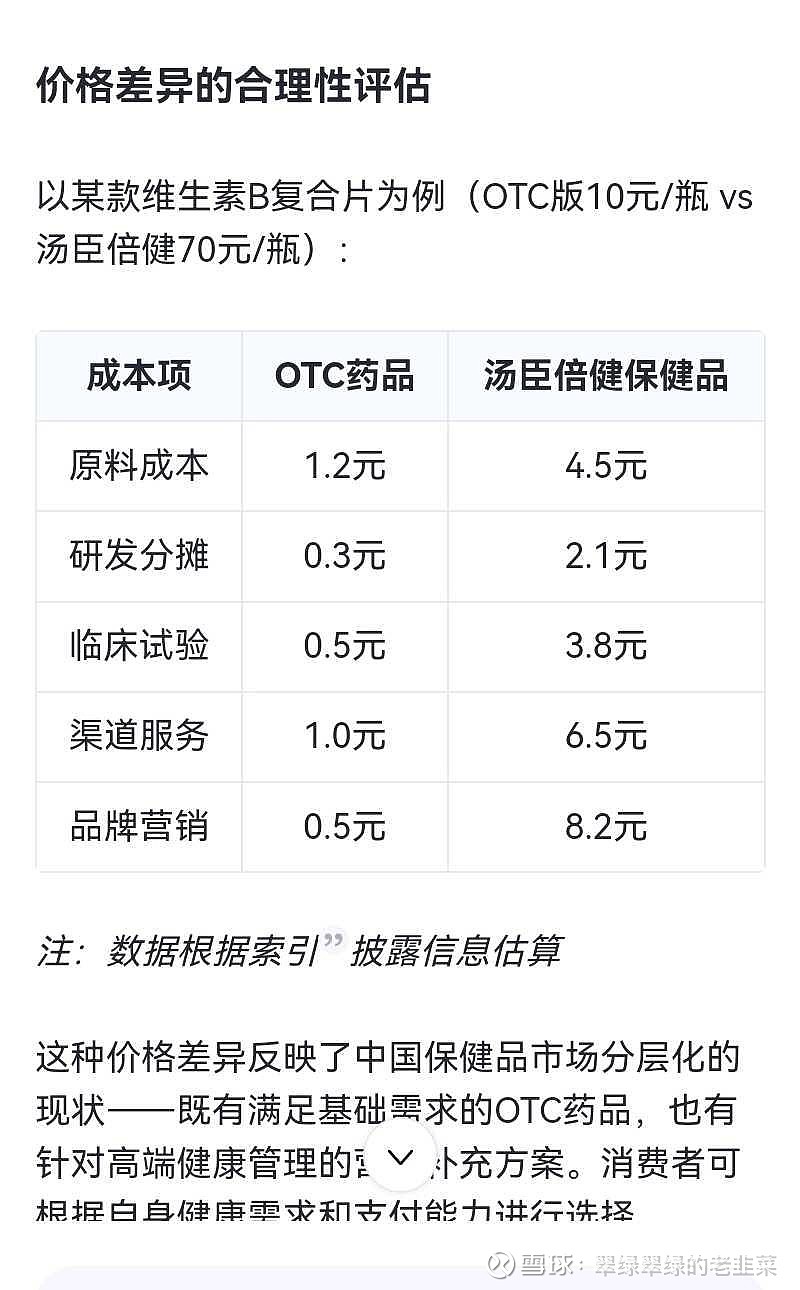 $汤臣倍健(SZ300146)$ 卖的量越大成本越低,假如40块一瓶的维生素B综合成本是24.1,狠一点直接降价一半卖20块一瓶,销量能翻3到5倍,翻三倍的话,研发临床渠道品牌营销单瓶成本能降低三分之二,降到7块,一瓶综合成本就是11.5,卖20也一样赚钱,销量翻5倍就大赚特赚了,足够便宜,营销费用其实也可以大幅减少了。😂