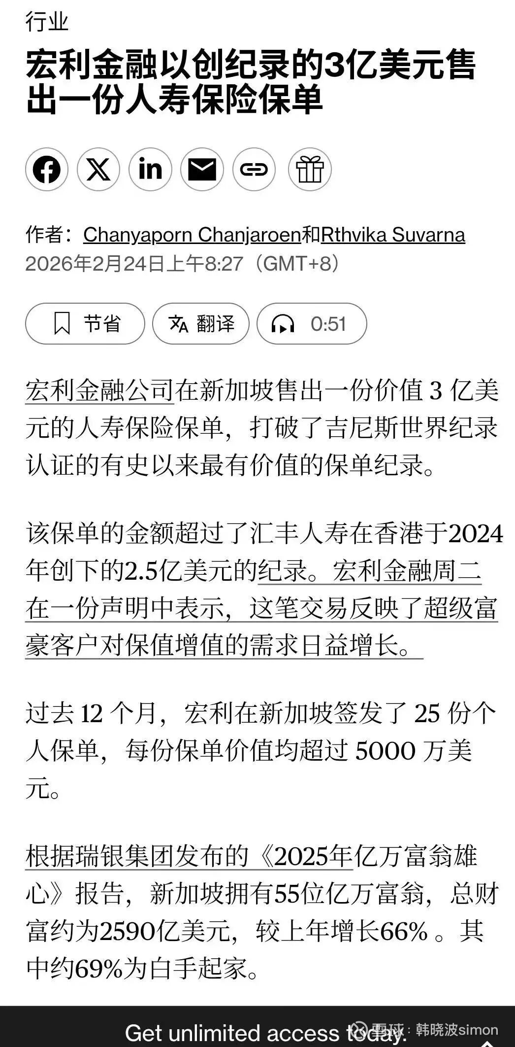 一则消息震动金融圈:宏利金融在新加坡售出一份价值3亿美元的人寿保单,刷新了吉尼斯世界纪录。这不仅是数字上的超越——超过了汇丰人寿2024年在香港创下的2.5亿美元纪录——更揭示了当下全球高净值人群最真实的焦虑:钱,该放哪里?
