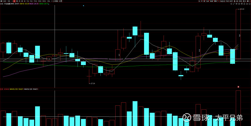从短线角度来看,1号线是立桩阳线,但是分歧比较大,上影线大于实体,次日放量不及预期,冲高回落未能突破1号K线上影线,看调整。一直到2号K线,平均1/2-3/4的量能洗盘,2号K线放倍量突破1号K线的开盘价,但是未能突破上影线的顶点。次日缩量不及预期突破不了1号K线的顶点,1/2量能强洗盘,今天放倍量突破1号K线得顶点与2号K线的顶点,趋势走强,后面调整看机会。