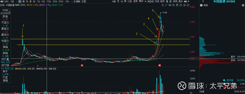 3号分歧大一部分释放1号的套牢盘以及底部筹码的获利盘,冲高回落不破1号线的收盘价2.9,次日放量拉升站上1号线的开盘价,但是量能超过1号线的量能,属于强反。