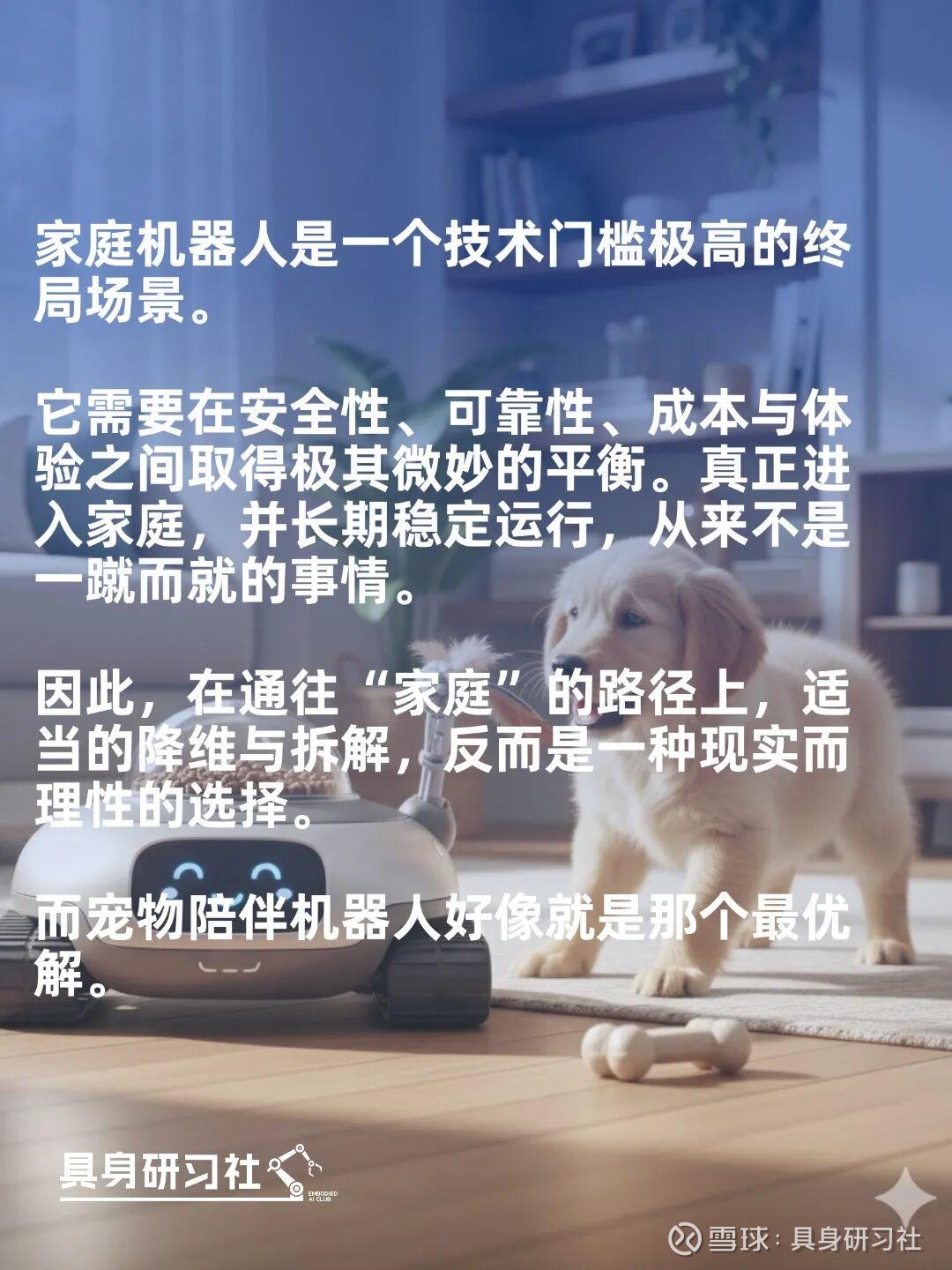 与此同时,当机器人在陪伴宠物的过程中,持续积累家庭环境下的导航、避障、交互与运行经验时,这些数据与工程能力,终将反哺到真正意义上的家庭陪伴机器人——那个最终是“陪伴人”的形态。