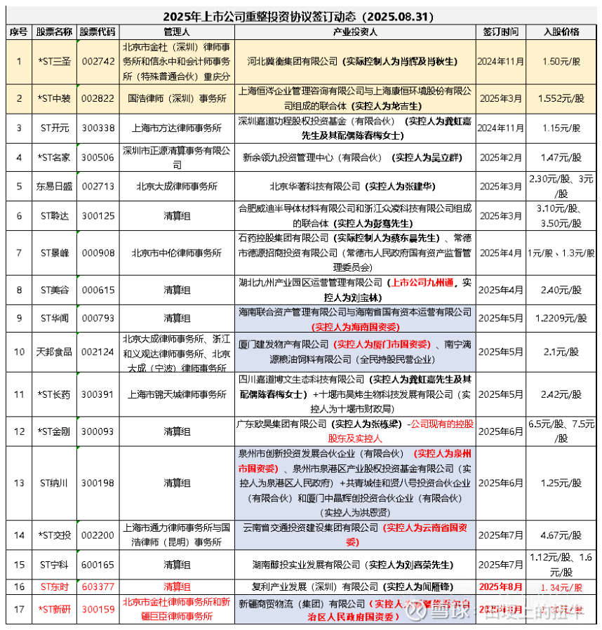 上表是截止【2025.08.31】的2025年上市公司重整投资协议签订动态,借花献佛,转摘于网络股友。从相关重整股受让对价的【绝对值】来说,ST中基的受让对价,并不是最高的,但也不是最低的,属于【中等水平】。