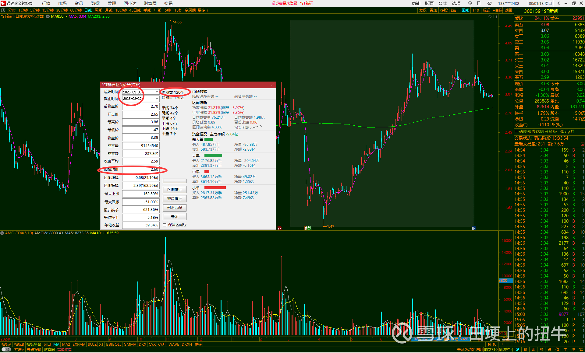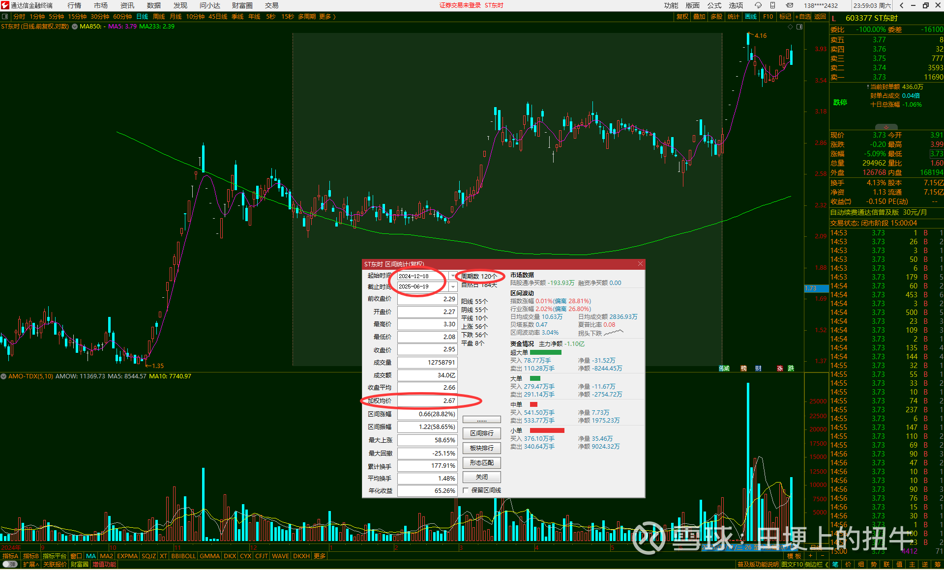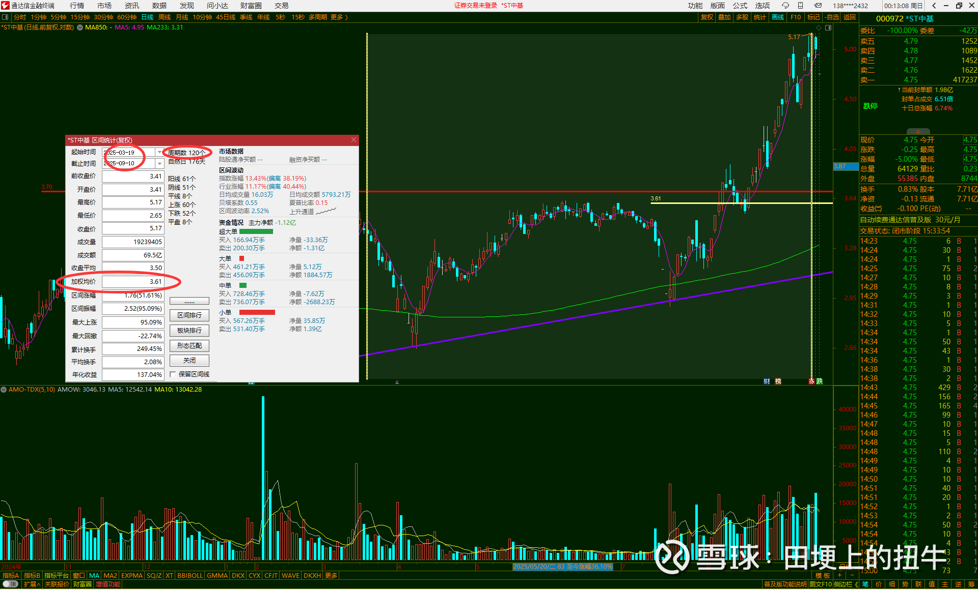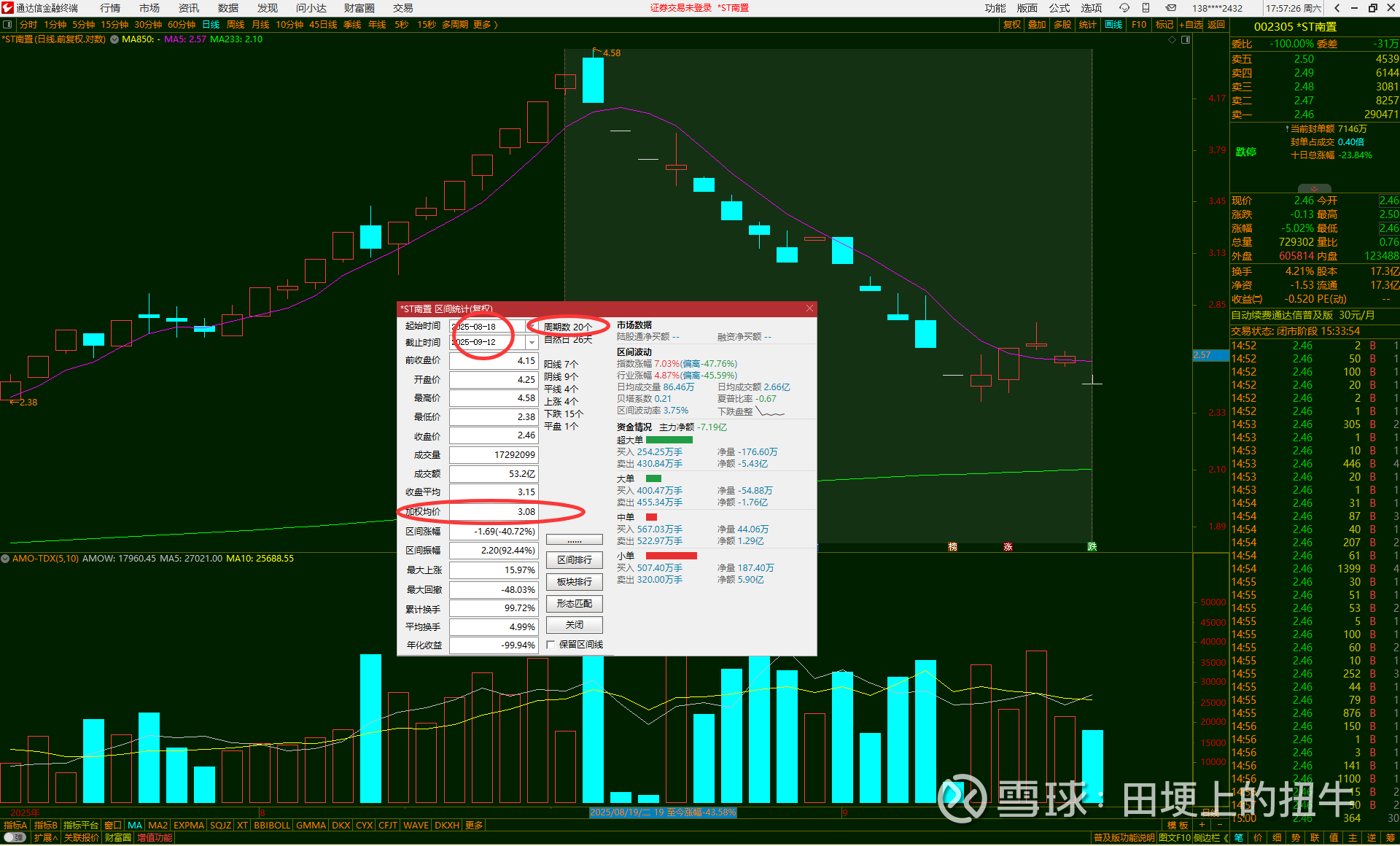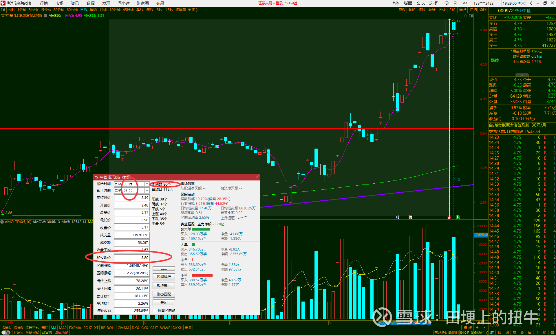 其仅用【20个交易日】,股价从【最高4.58】跌到【最低2.38】,近乎【腰斩】,区间跌幅【-40.72%】,最大回撤【48.03%】,【交易均价3.08】。如果ST中基从【5.00】开始跌,一路复制,最终的【交易均价】可能在【3.50附近】。