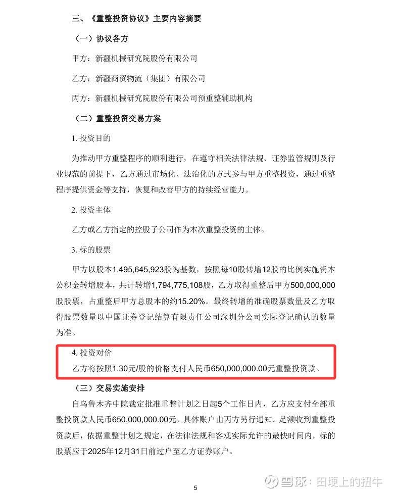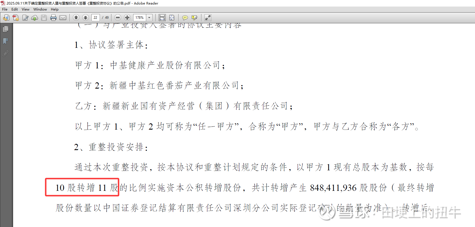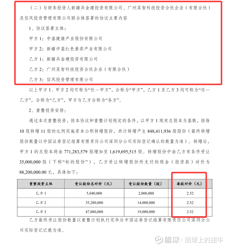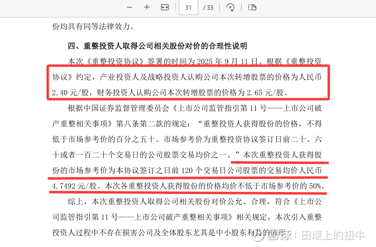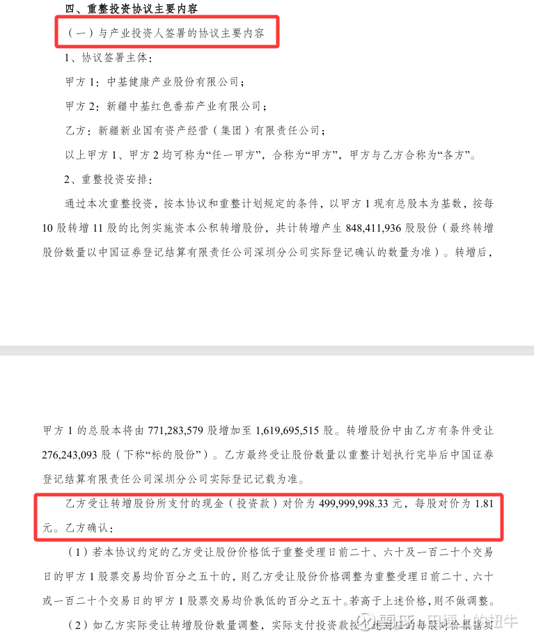 2025.09.11,本周四,晚上【21:33】,$*ST中基(SZ000972)$ 发布了【关于确定重整投资人暨与重整投资人签署《重整投资协议》的公告】,也即《重整投资协议》。因为ST中基预重整的开始日期比较晚,2025.07.28六师中院受理预重整,2025.08.28才完成债权申报,所以,在我原有的预期里,《重整投资协议》可能要9月下旬才会出,没想到提前了十几天。这也证明,ST中基的重整进度,要比我预期的快很多,所以,【重整路条】,也有很大可能快速落地。