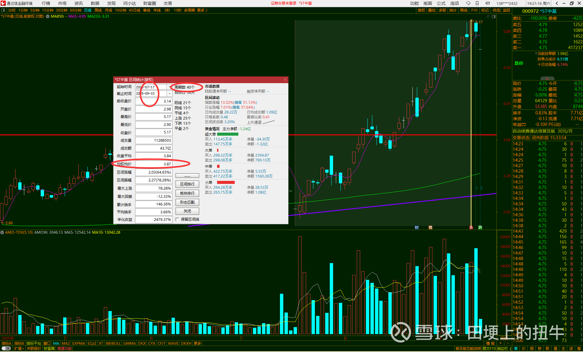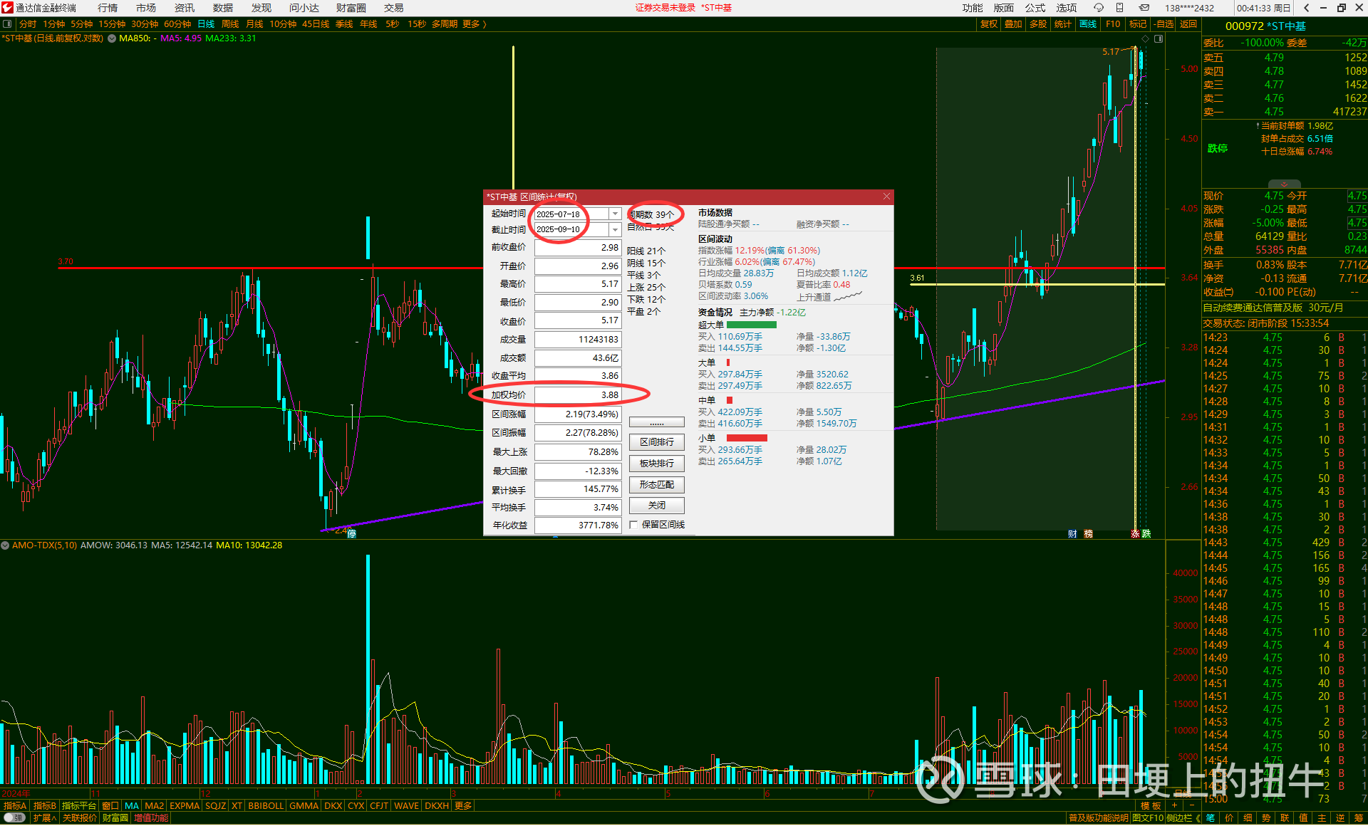 我们再来看看【07.17-09.10】这【40个交易日】的交易均价,数值为【3.87】,也就说,即使未来【40个交易日】,ST中基反着走,最低价跌破【3.00】,达到【2.90】,其交易均价也才【3.87上下】,距离【3.62元】差距【0.20以上】。而这【40个交易日】,ST中基的区间涨幅【64.65%】,区间振幅【78.28%】。