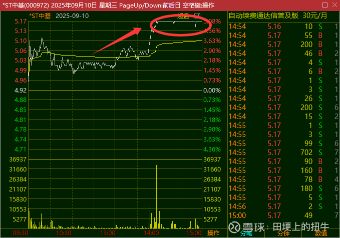 【2025.09.10】最后一个交易日,$*ST中基(SZ000972)$ 是以【涨停板】收盘,但拉升是在临近【14:00】,且【14:00】强势封板,但因当天大盘整体走势偏弱,反复震荡,多空不明朗,ST中基的封单,两次被砸,出现了两次【炸板】,时间也都不短,而且第二次【炸板】的【力度和深度】也更大,时间更是在【14:54】,已经临近收盘和最后三分钟的集合竞价,但都被【神秘力量】【强势回封涨停】,可见这个【5.17】的收盘价的【重要性】,因为这个【涨停价5.17】决定了【120日交易均价】的最后数值是【3.61元】,所以,这个【涨停价5.17】就是新业集团的【生死防线】,【绝不容失】!