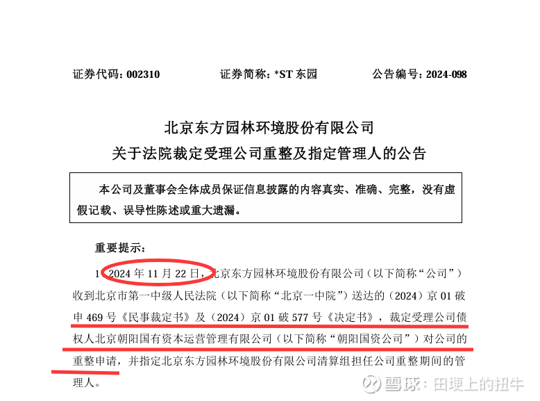 去年ST东园的重整受理日是【2024.11.22】,如果也按这一天计算,扣除国庆假期后,还剩【44个交易日】。