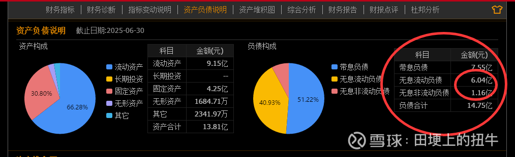 同样取整,我们按重整完毕之日,ST中基的总市值是其【总资产的5倍】和【净资产的7倍】。当下,ST中基截止【2025.06.30】半年报,其【总资产为13.81亿】【净资产为-1.02亿】,其【总负债14.75亿】,其中【有息负债7.55亿】【无息负债7.2亿】,一般重整化债都是化的无息负债即应付账款居多,银行或其他机构的有息负债,一般都是【有担保债权】。