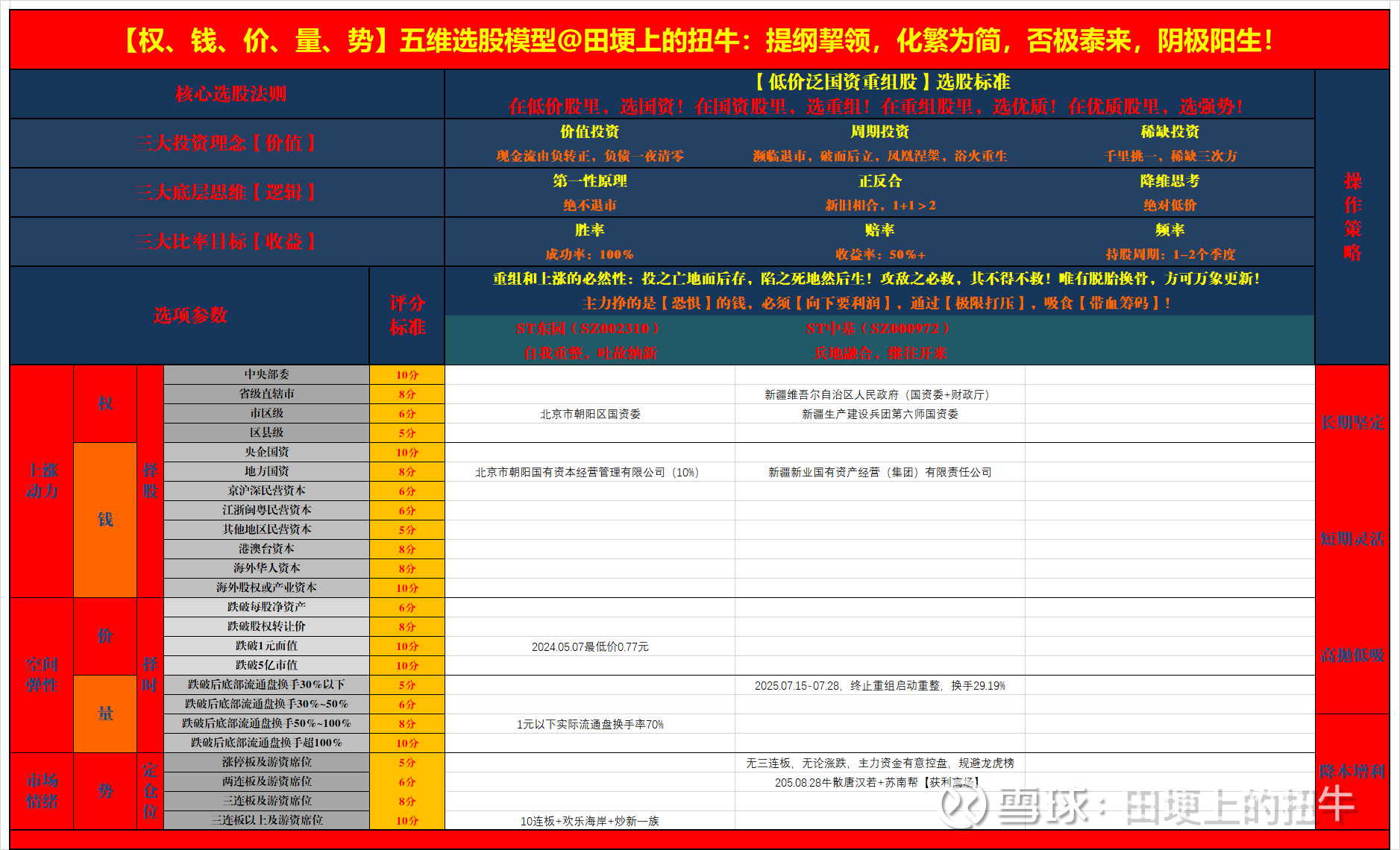 所以,我决定在今明2年(即2025和2026)的时间里,依旧重点聚焦【低价泛国资重组股】,择优重仓打响【退市保卫战】的【泛国资属性】重组股(广义的重组股,包含重整股),即【在低价股里,选国资;在国资股里,选重组;在重组股里,选优质;在优质股里,选强势】!