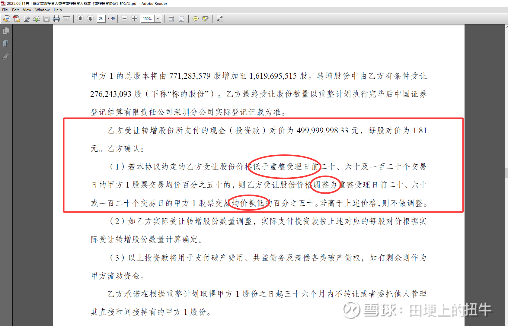 我仅仅说一个大体的【个人估算值】,新业集团的重整投资总金额是【5亿元】,对应的转增股数是【2.76亿股】,每股对价【1.81元】。我预估的新业集团【补差比例】【上限】在【10%左右】,也即【5000万元】,大概率是【5000万元以下】的【3000万元左右】,也即【6%】。