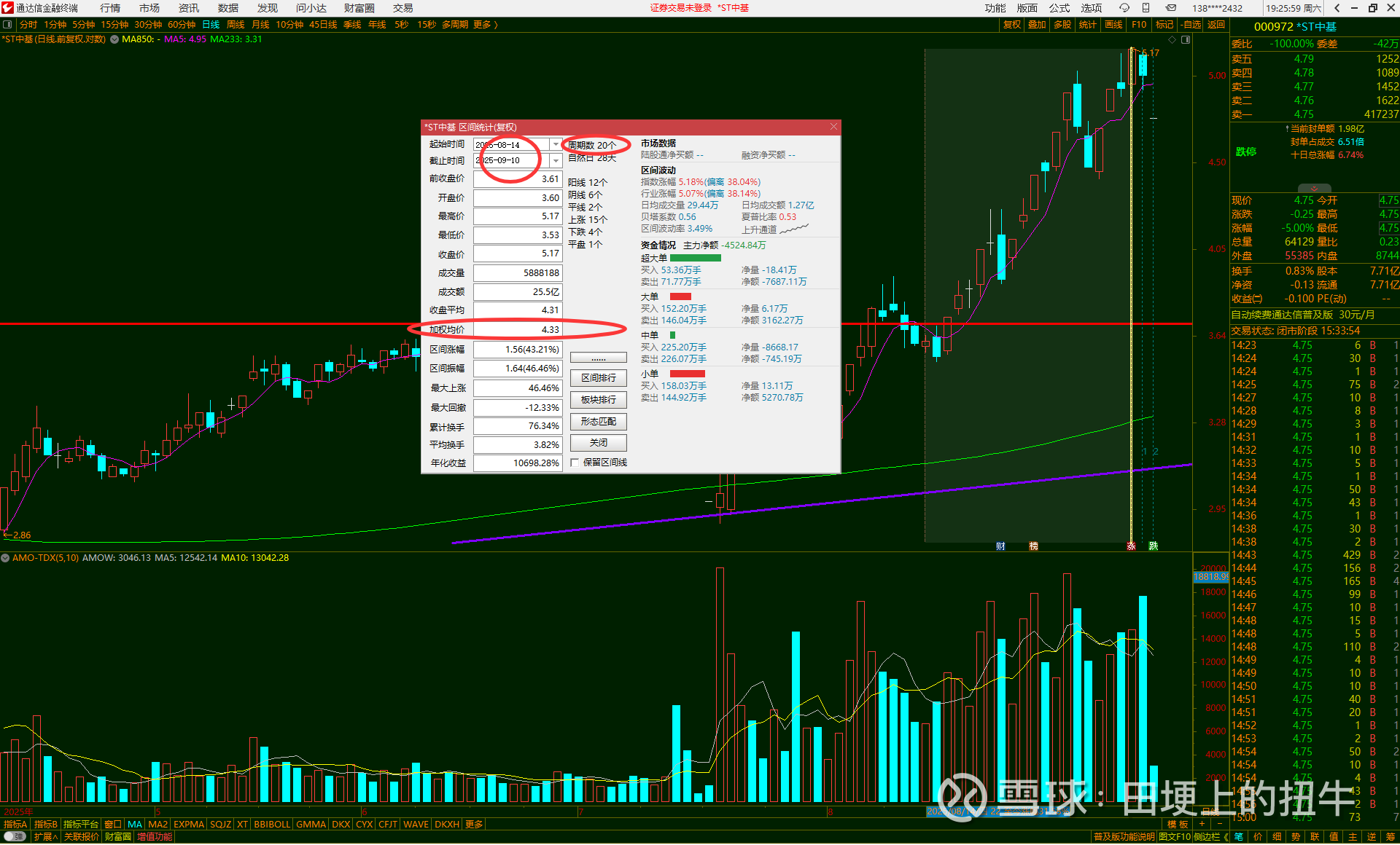 这是【08.14-09.10】【20个交易日】的走势图,算是比较强势的了,区间涨幅【43.21%】,区间振幅【46.46%】,但其交易均价也即加权均价却高达【4.33】。也就是,即使从【09.11】开始,ST中基展开完全相反的技术走势,其得到的【交易均价】大概率也在【4.33元上下】,距离【3.62元】差距巨大。