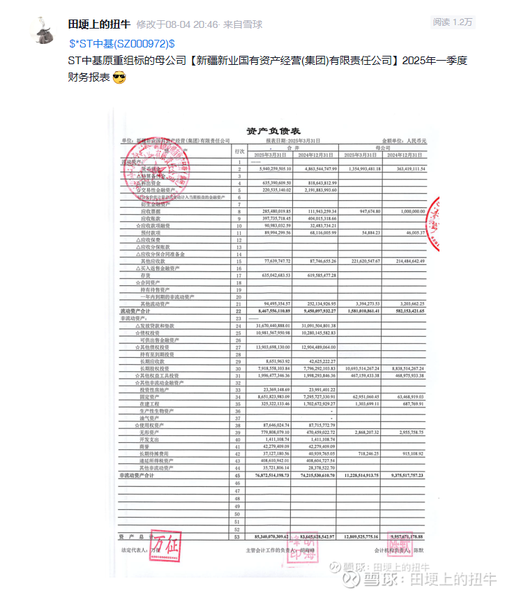 所以,当时我就预判,ST中基重组变重整,就是因为时间紧,任务重,最后必然【换汤不换药】,新的实控人还是【新业集团】的概率最大,这是新疆早就定好的【军资转国资】的【兵地融合示范项目】。为此,我还特意转发过新业集团2025年一季报的资产负债表。