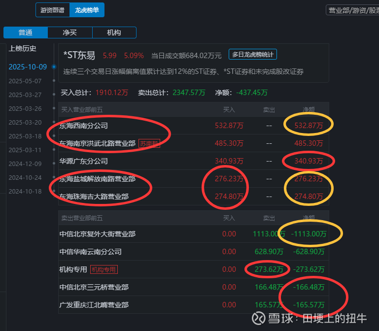 回复@田埂上的扭牛: $*ST东易(SZ002713)$ $$ST板块(BK0400)$ 这个龙虎榜,有点意思,【东海证券】和【中信证券】这是准备效仿【东财拉萨】吗?一共10个席位,你们占了【7个】。如果不是,你们凭什么可以在【三天一字板】期间【肆意买卖】,而且一个都是买,一个都是卖?这是什么运气,这是什么概率?还有几个买卖席位的金额数据,也是基本相等。从阴谋论的角度看,我只能猜测是主力资金在互倒!有兴趣的股友,也可以放飞自我,自己想象一下,也许能被你们猜到最准确的那个答案