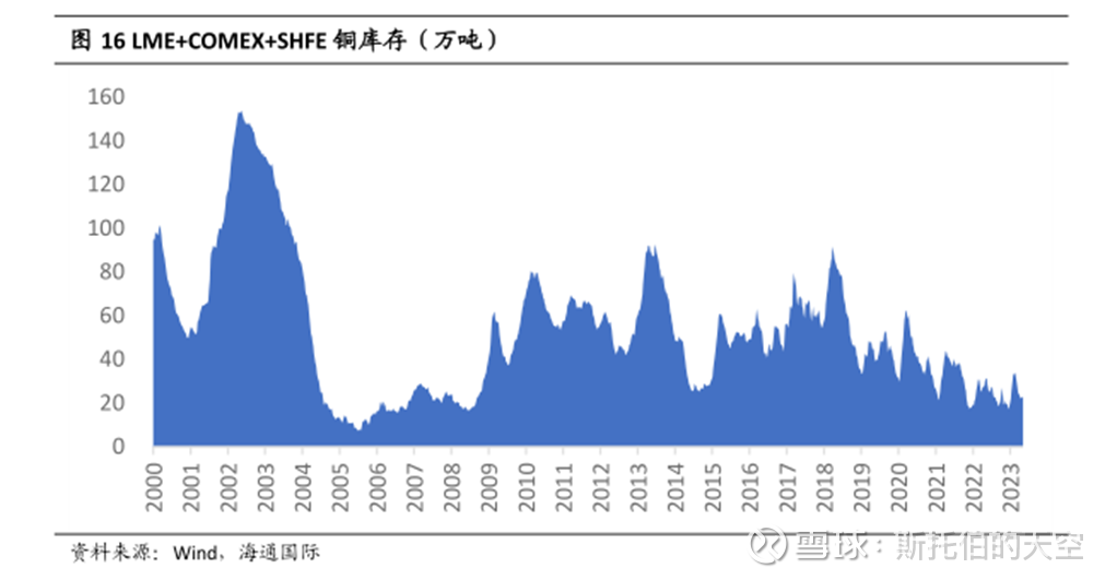 再看看交易所的情况,全球主要交易所的铜库存最近十几年整体一直下降,尤其是峰值一直降,因为实在屯不住这么多精铜了: