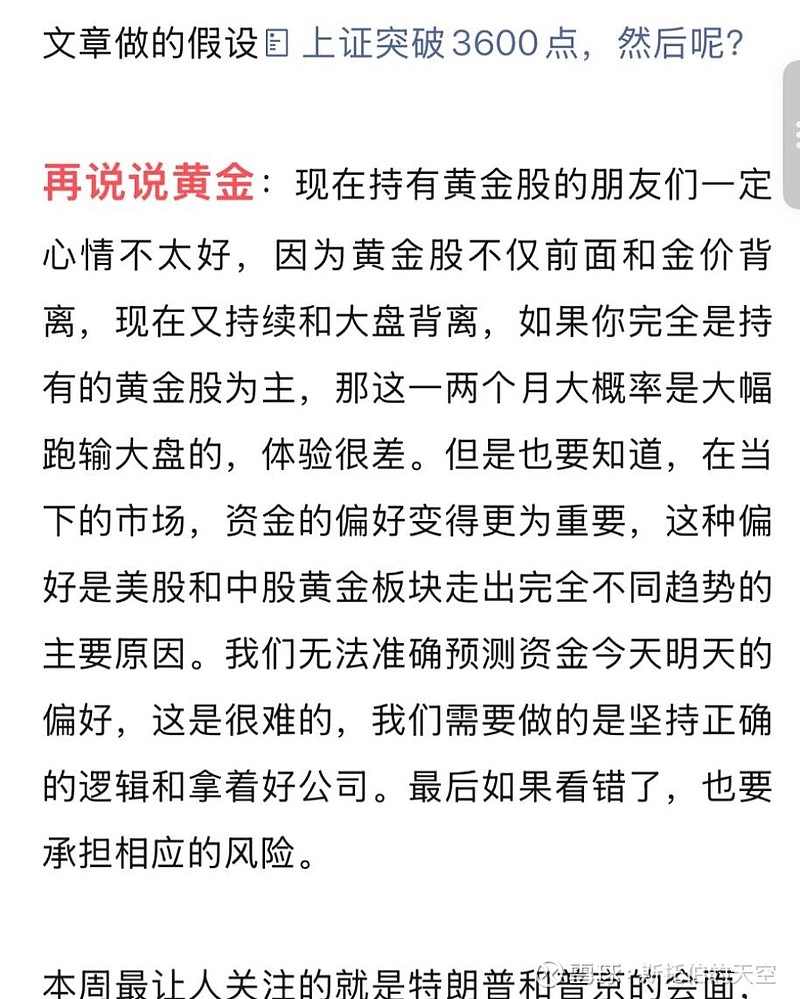 去年924以来,黄金股和金价背离(并且同时和大盘即金价背离)事情,发生过至少三次,一次是去年924到年底,一次是今年七八月,第三次就是现在。背离最离谱的就是924到年底,那是长时间大幅度背离大盘和金价,很多人都拿不住。这种背离在过去(924以前)A股历史上是基本没出现过的,过去都是黄金股领先于金价或者和金价同步,正常走势也应该是这样。这个我过去已经分析过了,主要是资金问题,跟基本面无关。只要主逻辑在,趋势就在,时间早晚问题,被大盘带崩比跟大盘背离要好,因为反弹的时候也会更快。