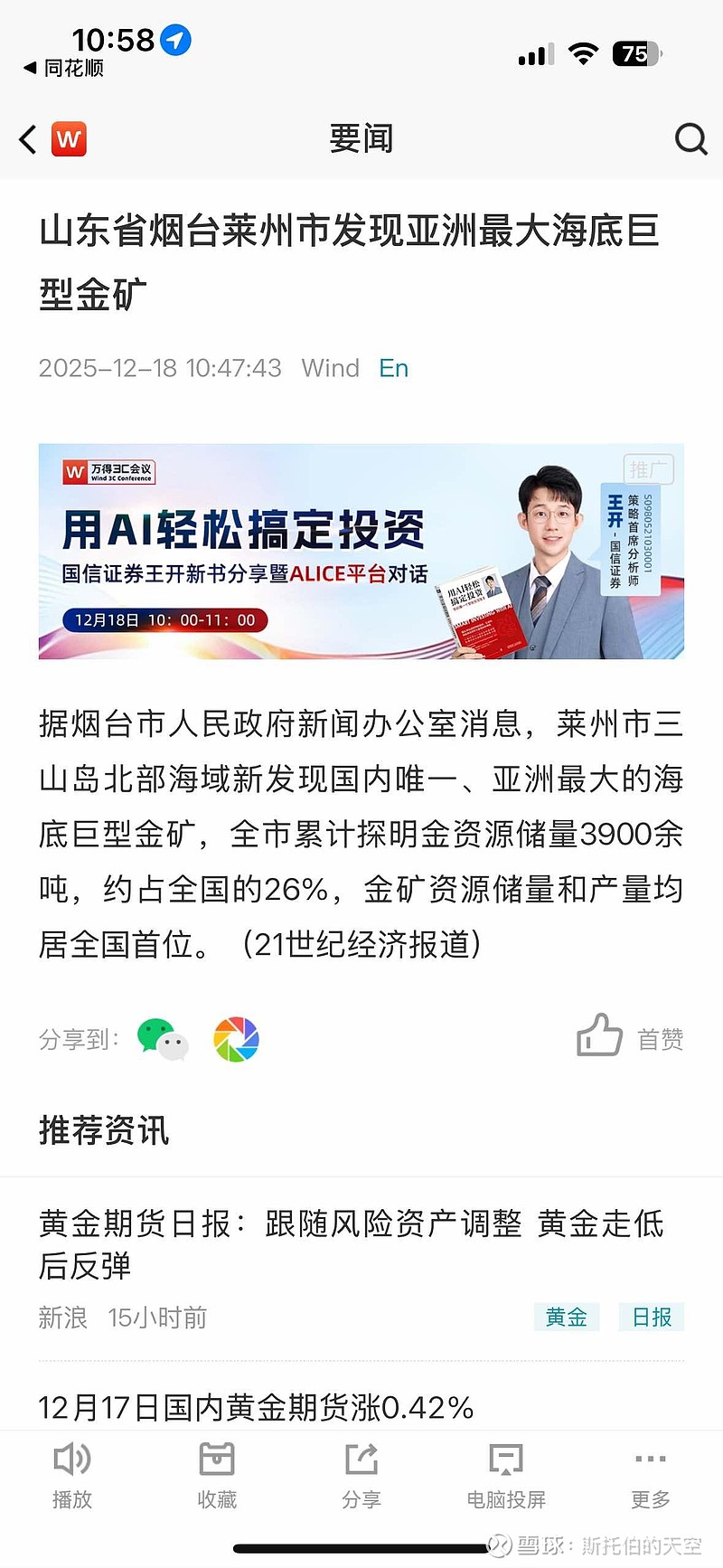 应该不是新发现的,不然太离谱了,应该就是海域金矿,进行了新的探明。招金矿业是直接受益的,而且我预计很快会投产。目前需要放点信息出来提振金矿价值,金矿股绝对是被严重低估了。$招金矿业(01818)$ $赤峰黄金(06693)$