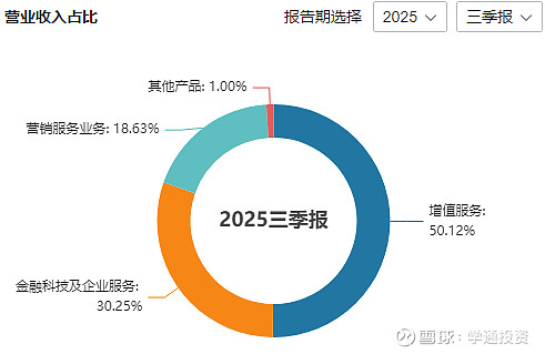 接下来我们谈谈腾讯的核心业务。2025年三季度,腾讯的业务构成是增值服务占比50%,金融科技及企业服务占比30%,营销服务业绩占比19%。