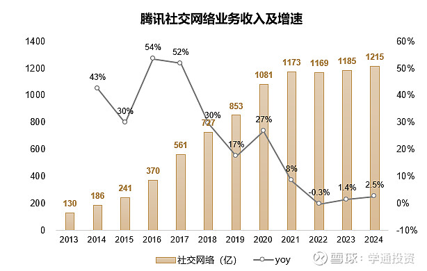 社交网络业务,(2013-2018)是高速增长期:收入从2013年的130亿元迅猛攀升至2018年的727亿元,年增速持续超过30%。核心驱动力是微信生态的爆发(用户增长、朋友圈广告、支付服务商业化)及数字内容订阅(游戏、音乐、视频会员)的协同效应。