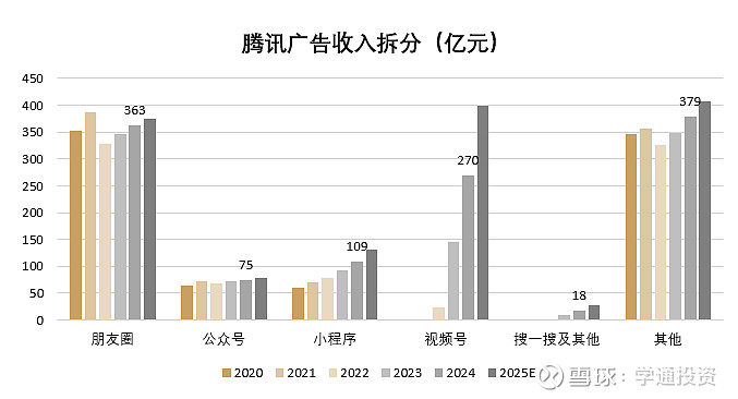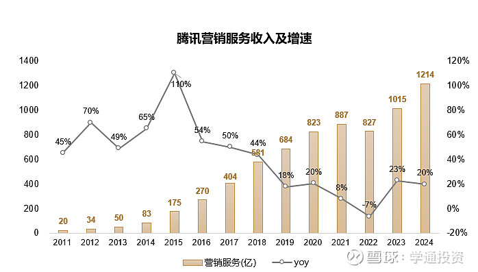 营销服务业务,这个主要是广告业务。过去腾讯广告业务在微信流量红利释放过程中实现了高增长;2022年由于经济下行及部分行业监管趋严,广告需求被动收缩,腾讯广告收入首次出现下滑;2023 年是腾讯广告业务的 “复苏转折年”,核心依赖 “视频号破局 + AI 赋能 + 生态协同”。