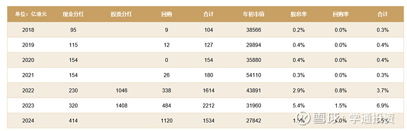 现金分红逐年提升,2024年达414亿港元。2022年和2023年还有“京东”与“美团”实物分红。