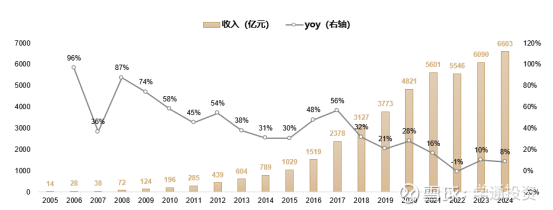 接下来再看一下腾讯的财务数据增长情况,腾讯营收从2005年14亿元跃升至2024年超6000亿元,腾讯的成长是中国互联网黄金二十年的缩影,清晰地分为三个阶段: