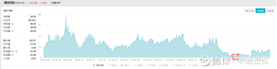 (2019-2022),腾讯也经历了宏观经济下行的压力测试:业务上,用户增长见顶,宏观经济承压,游戏行业监管调整,反垄断政策。2022年,腾讯迎来了上市以来首次年度营收下滑,下滑了1%。市场一度怀疑,巨头的增长故事是否已然终结。当时的估值也打到历史最低值,跌破10倍,股王跌到10倍,历史上看,都是重大的机会,茅台2014年跌破10倍;苹果2016年也跌破10倍。