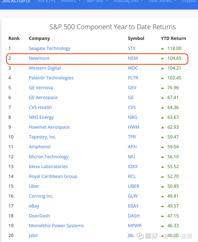 美股$标普500指数(.INX)$ 里,只有一支黄金矿股,$纽蒙特矿业(NEM)$ ,年初至今涨势排第二名。