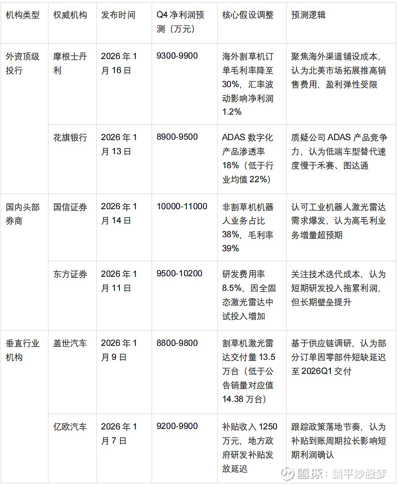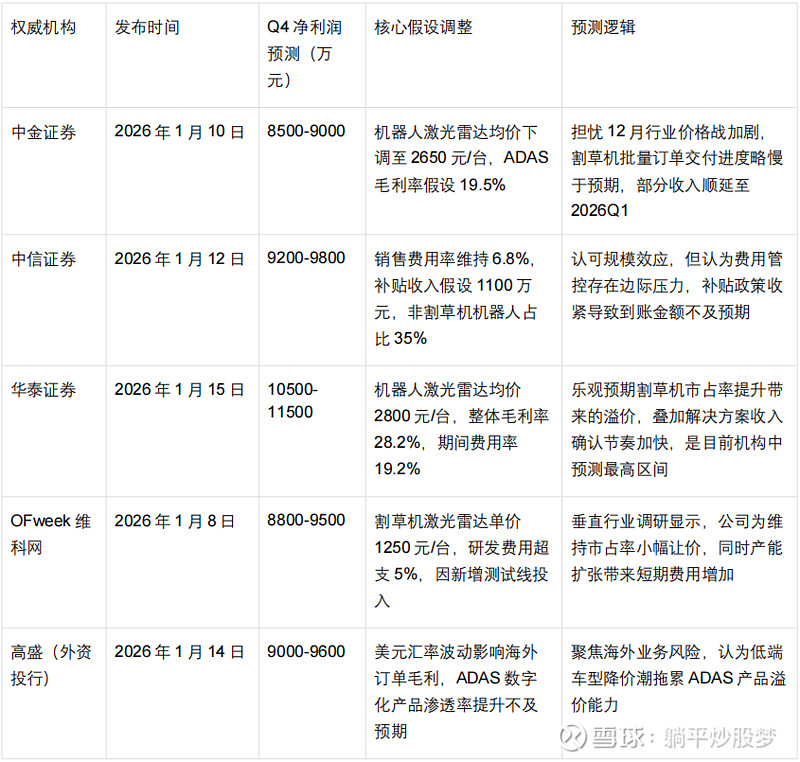 $速腾聚创(02498)$ $禾赛-W(02525)$ $激光雷达(BK1556)$ Q4销量数据已经公告,近期中金证券 中信证券 华泰证券 OFweek维科网 高盛(外资投行) 摩根士丹利 花旗银行 国信证券 东方证券 盖世汽车 亿欧汽车等机构均对激光雷达企业速腾聚创作了利润预测更新,让我们拭目以待,等落地了,看看哪家更有实力。2026年能不能市值向禾赛靠拢点呀,机器人产业在春节期间会不会继续有更好的热度,春晚会有速腾的产品上吗?L3自动驾驶两会前会有更高热度吗?