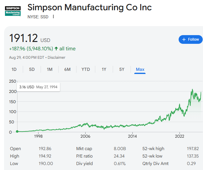 这不由让我想到最近读的一本名叫网页链接{Strong Ties}的书,讲述巴菲特觊觎,芒格盛赞的长期复利机器$辛普森配件制造(SSD)$ 的故事。辛普森配件制造的是屋梁连接件,这本是一种高度同质化,在价格元素上血拼的产品。可就是这样一个看上不起眼的生意,却在上市以来的31年间,为股东创造了年化21.6%的出色回报。