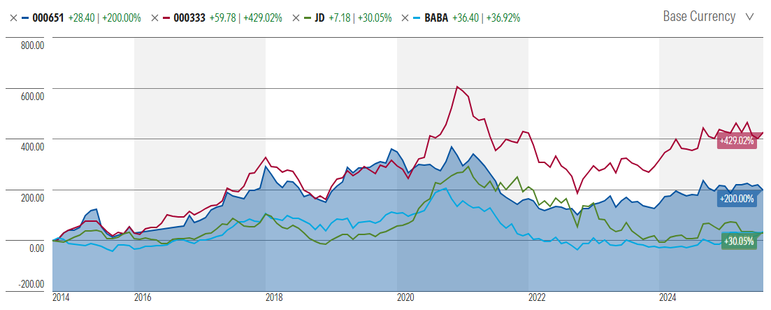 中国也并不是没有这样的板块。董明珠有我很多不喜欢的地方,但她至少有一点我很欣赏,就是把产品做好,然后起到龙头的带头作用,不打价格战,把赚到的资本投入去做更好的产品,同时在规模化的过程中也可以自然地将生产成本的下降传导到价格端,由此形成一个良性循环。加上理性的竞争对手和寡头竞争格局,造就了很不错的长期股东回报(格力和美的因为股息率一直都不错,因此如果除权的话,相信长期回报更是远胜于阿里,京东,和美团)。