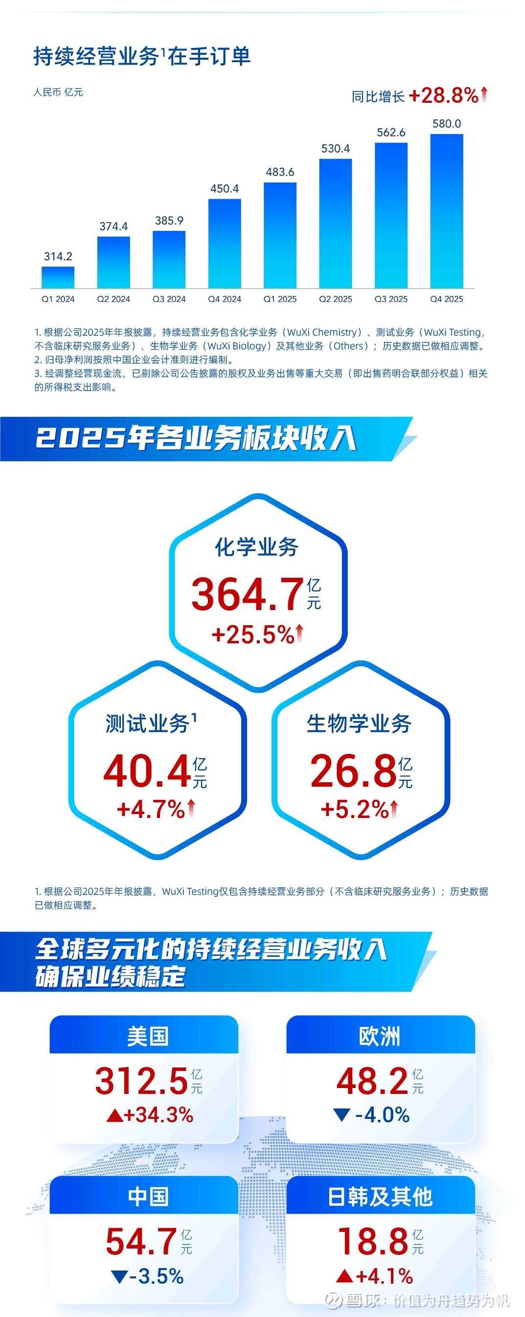 2025年是$药明康德(SH603259)$ 的“分水岭”之年。公司交出了一份“利润翻倍、现金充沛、订单饱满”的亮眼成绩单,尤其是在剥离非核心资产后,主业更加聚焦。虽然净利润的大幅增长部分源于非经常性损益,但化学业务(特别是TIDES)的爆发性增长和高达580亿元的在手订单,为未来两年的增长提供了极高的确定性。