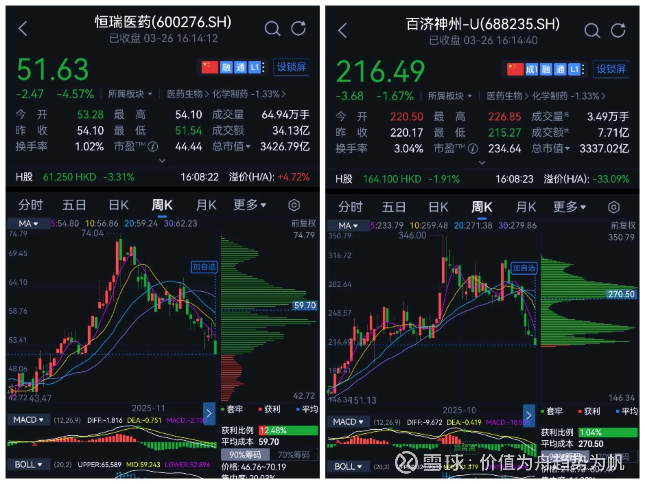 2025年2月21日,百济神州A股市值首次超越恒瑞医药;5月,$恒瑞医药(01276)$ 成功登陆港交所后短暂反超;6月12日,百济神州市值突破5000亿元,再次夺回王座。截至2026年3月27日,恒瑞医药市值3426亿元、百济神州3337亿元,两家公司市值相差仅约89亿元,可谓是旗鼓相当,贴身肉搏仍在继续。