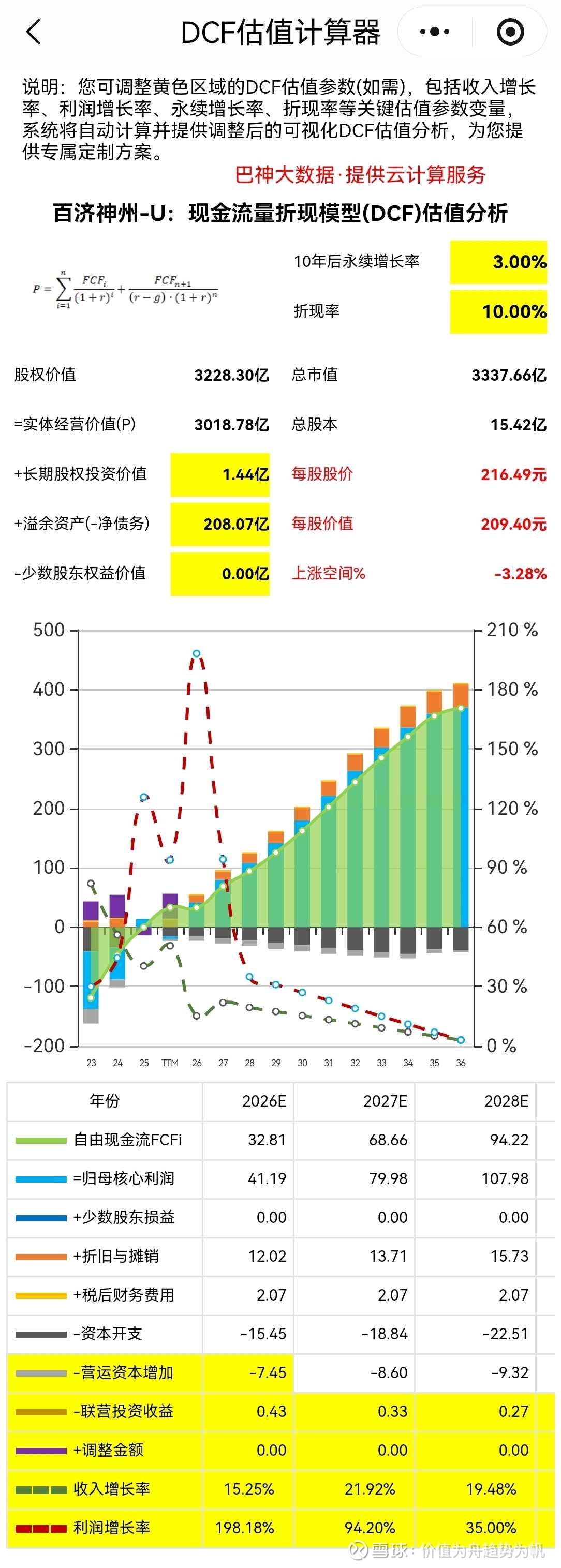 比如,上述对百济神州的DCF估值分析中,利润增长率从2027年的94.20%大幅下降至2028年的27.48%,降幅较大,如果将2028年的利润增长率调整为35%、此后逐年降低4个%至10年后的永续增长率3%,以此计算,百济神州的每股价值约为209.40元,与3月27日股价216元接近。如下图所示: