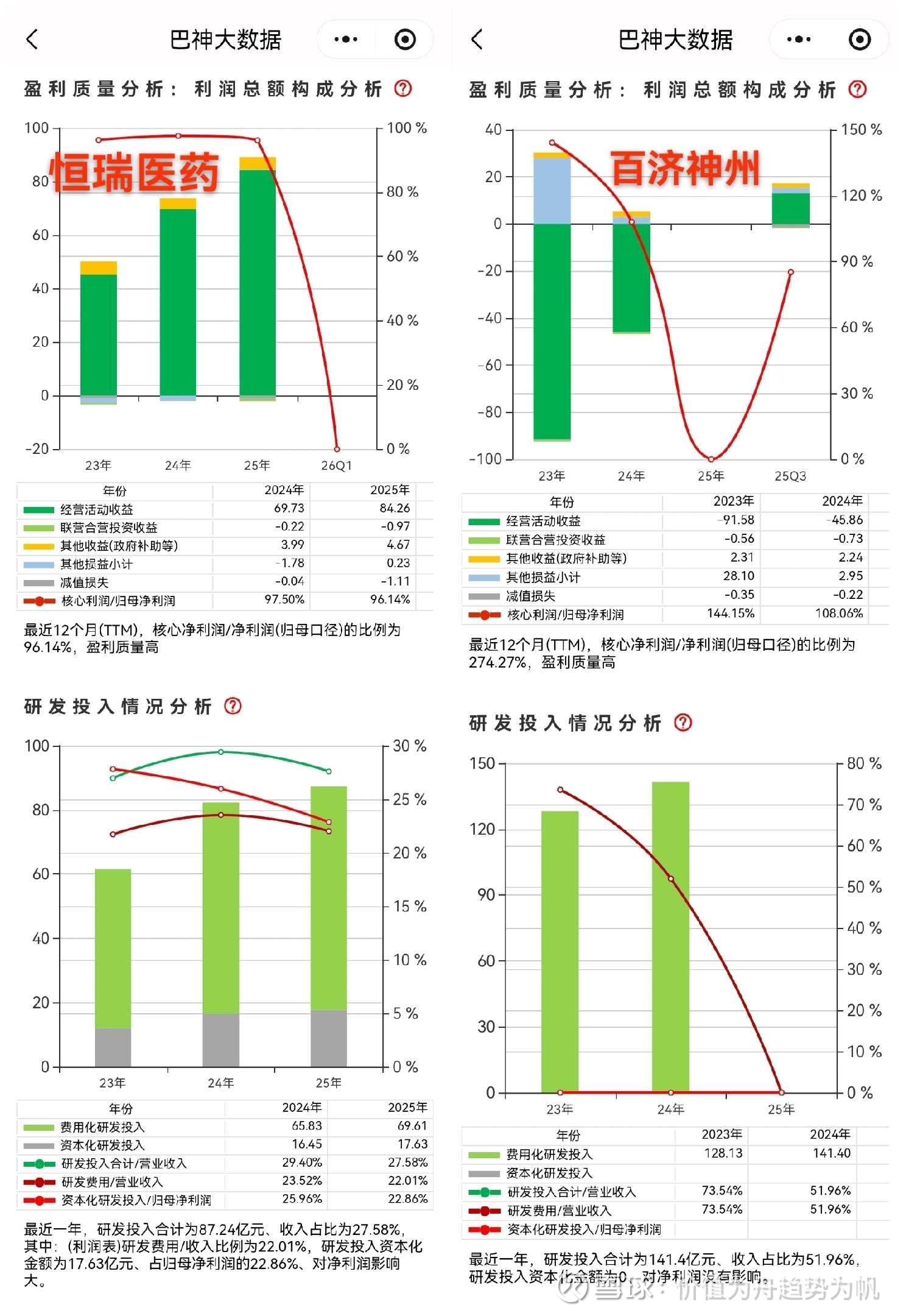 恒瑞的策略可概括为“快速追踪+差异化改良”。这种模式的特点是:研发风险较小、成本较低、周期较短,但产品容易陷入同质化。2025年,恒瑞研发投入87.24亿元,占营收27.58%,其中:69.61亿元研发支出作为费用化处理,而有高达17.63亿元的研发支出进行了资本化、达到2025年归母净利润的22.86%,若参照以下百济神州将全部研发支出费用化,恒瑞2025年归母净利润将从77.11亿元降至约59.48亿元(但这不影响现金流,只影响账面利润),这个问题值得大家注意一下。