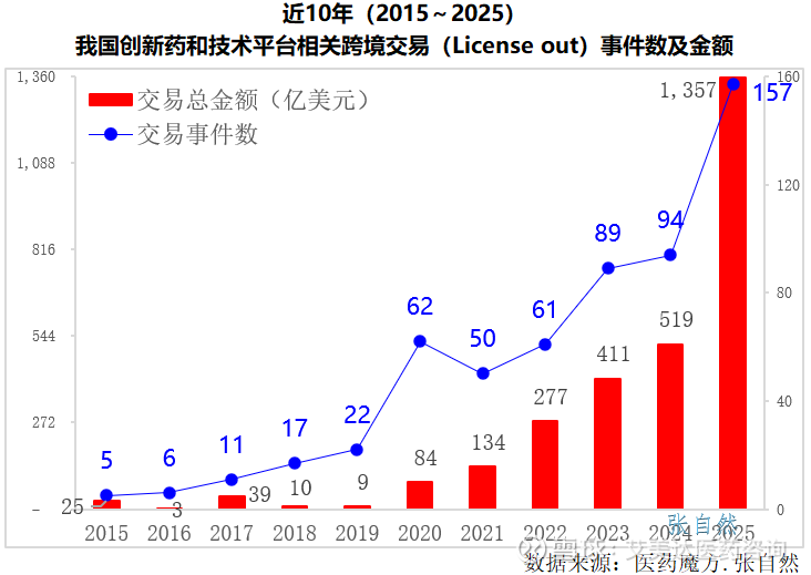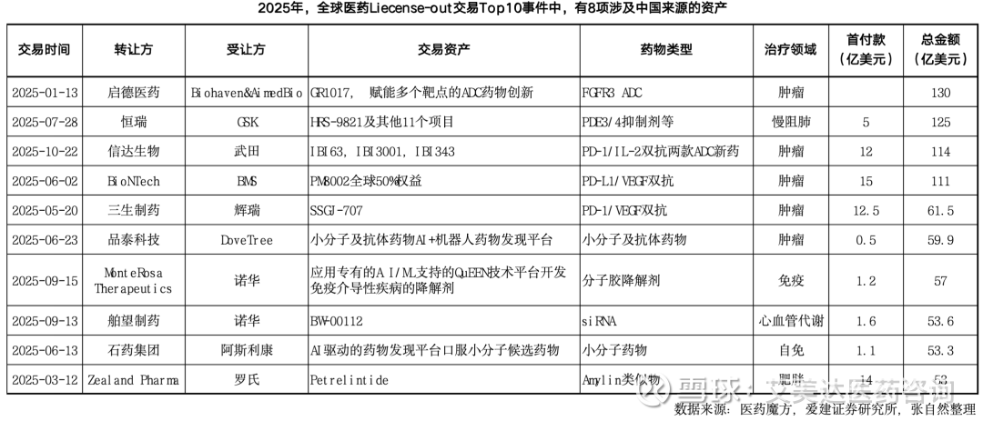 2025年,全球医药License-out交易总金额Top10项目中,有8项来自中国,其中,总交易额超过百亿美元的有4起,中国占了3起。