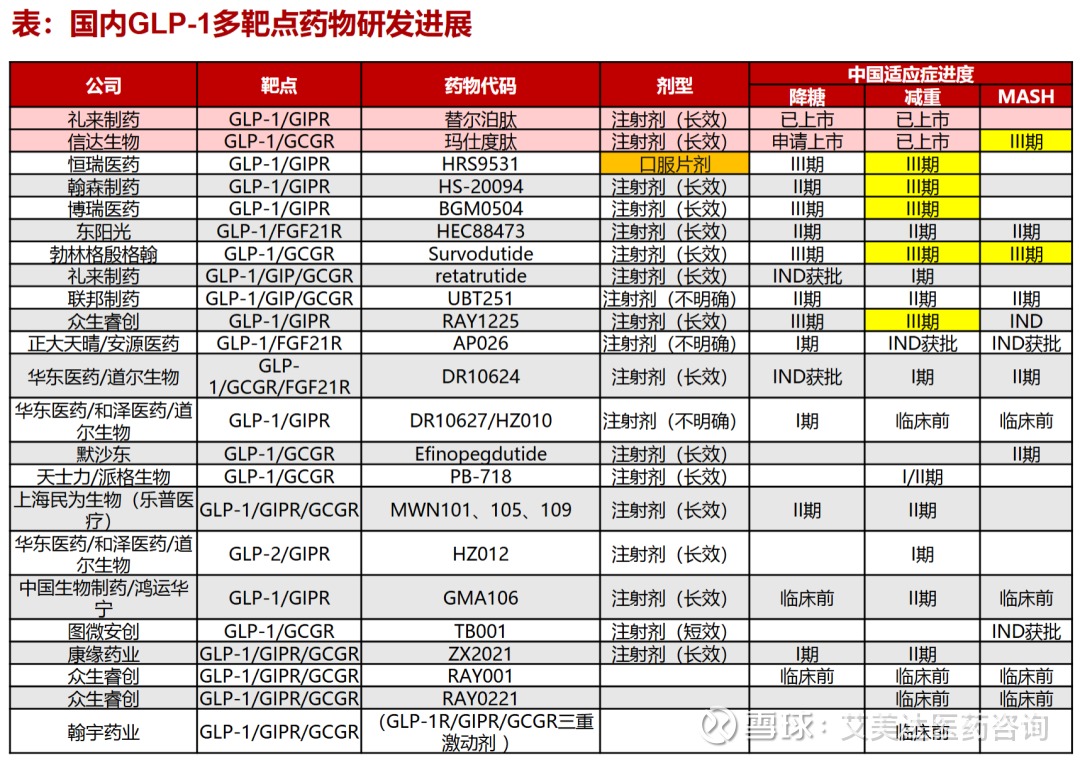 先从国内进度来看,双靶点/多靶点GLP药物中HS-20094算是仅次于礼来替尔泊肽、信达玛仕度肽的第二梯队选手,目前肥胖适应症正处于临床三期,研究已累计给药超一千名受试者,预计将在2026Q1公布数据结果。