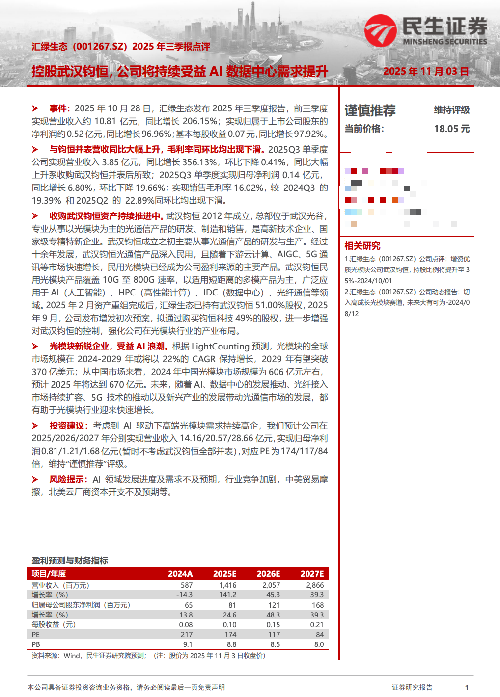 汇绿生态正通过发行股份及支付现金的方式,收购其已控股子公司武汉钧恒剩余的49%股权,以实现100%全资控股。此次交易总对价为11.27亿元,并拟配套融资不超过8.45亿元,用于支付现金对价和扩大光通信器件产能。