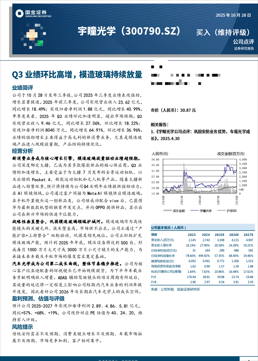 未来增长点明确,主要集中在模造玻璃产能扩张、ADAS车载镜头的突破,以及手机外置镜头渗透率的提升。此外,在手机玻塑混合镜头、光波导等前沿领域也与客户进行技术对接和送样。