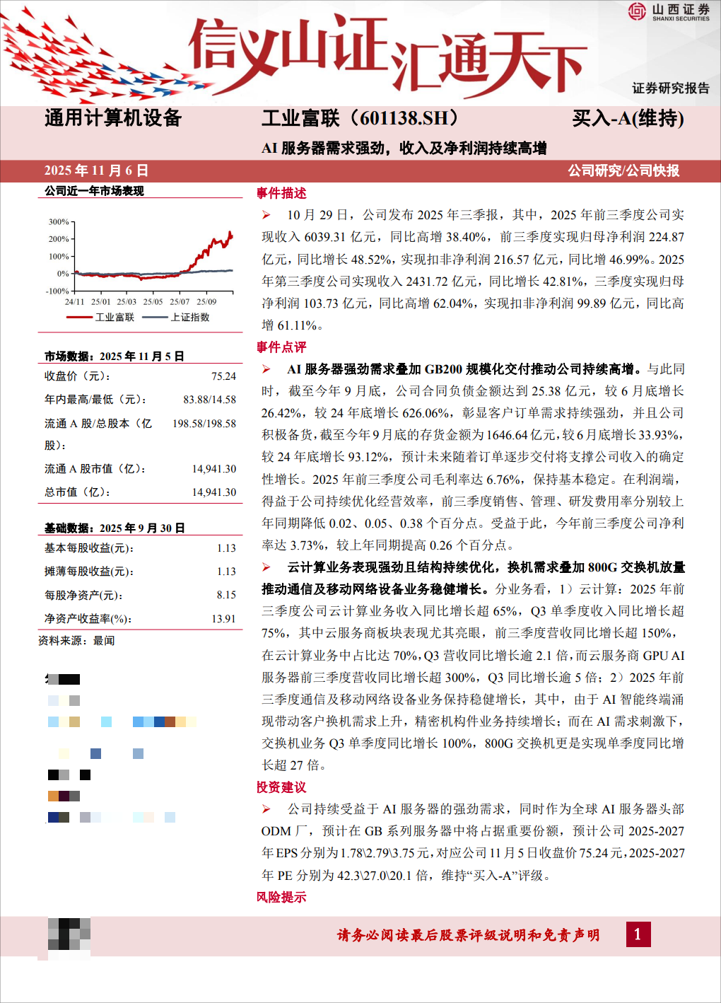 AI服务器需求强劲:受益于全球云服务商资本支出大幅增长,公司在GB200/300等产品上出货顺利,良率提升,预计四季度毛利率将继续改善。