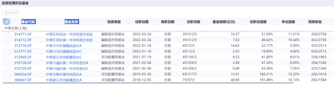 拉长周期,姜诚的业绩非常优秀,他长期管理的中泰星元灵活配置和中泰玉衡价值优选混合年化收益率都在15%+,并且同类排名前20%。