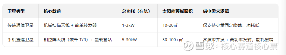 手机直连卫星的本质是 “把地面蜂窝网络搬到太空”,其核心载荷(相控阵 + 星载基站)的能耗是传统卫星的 3-10 倍,而太阳能翼板是低轨卫星唯一的持续供电来源(蓄电池仅能满足短时间阴影期)。因此: