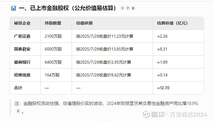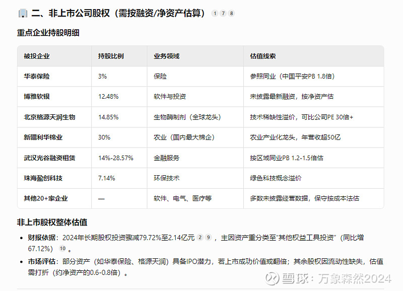 根据公开信息整理,华茂股份(000850.SZ)持有的对外股权资产涵盖金融、科技、矿业及生物技术等多个领域。以下分类列示明细及估值依据,结合最新财报及市场数据综合分析: