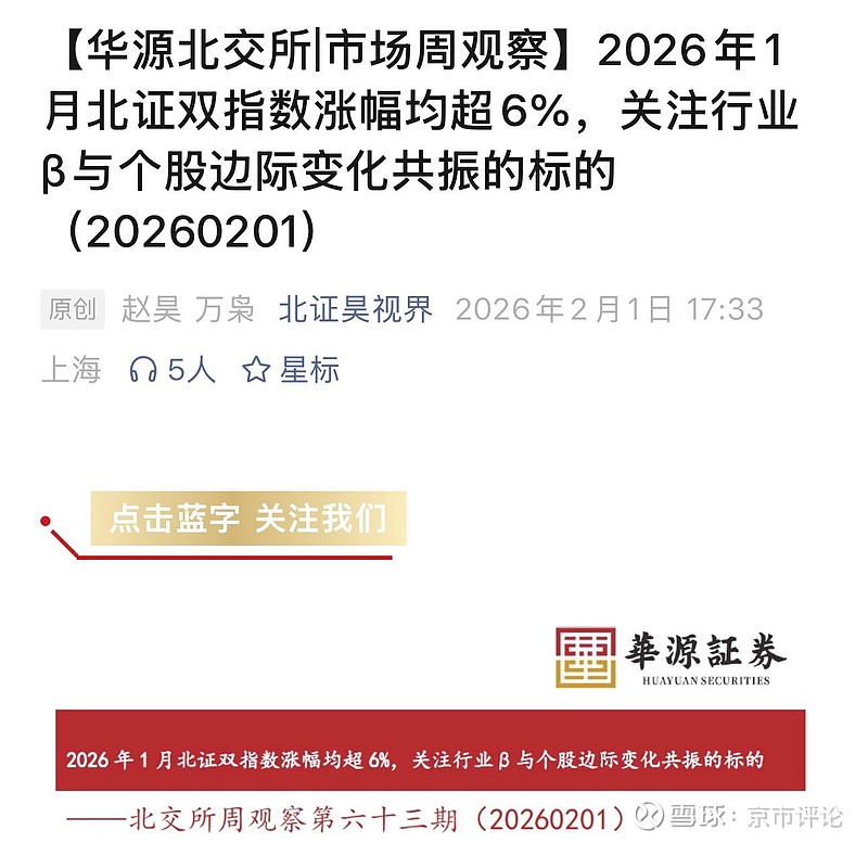 2026年1月北交所整体呈现“指数先扬后稳、成交环比回升、新股扩容提速”的运行特征。本周北交所2025年年报业绩预告已全部披露,整体业绩表现喜忧参半,其中业绩超预期或实现边际改善的标的,具备后续重点跟踪价值。