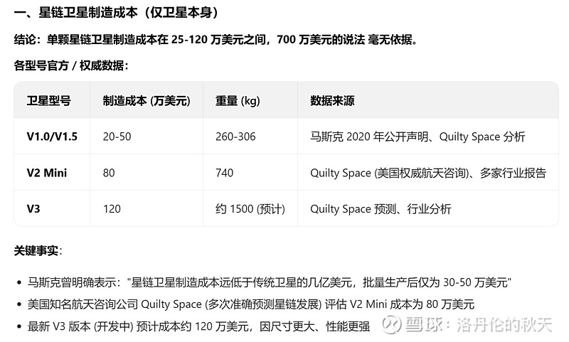 3、马斯克曾明确表示:"星链卫星制造成本远低于传统卫星的几亿美元,批量生产后仅为 30-50 万美元";