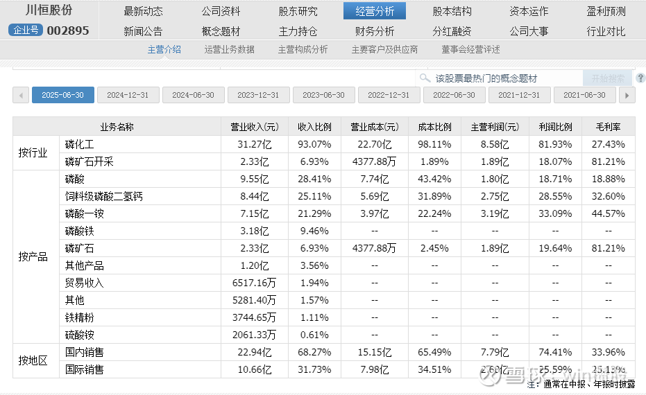 川恒股份(贵州川恒化工)不仅是国内领先的磷矿石开采龙头(产量排名前十),而且两大磷化工核心产品饲料级磷酸二氢钙和消防用磷酸一铵的市占率已多年稳居行业首位。
