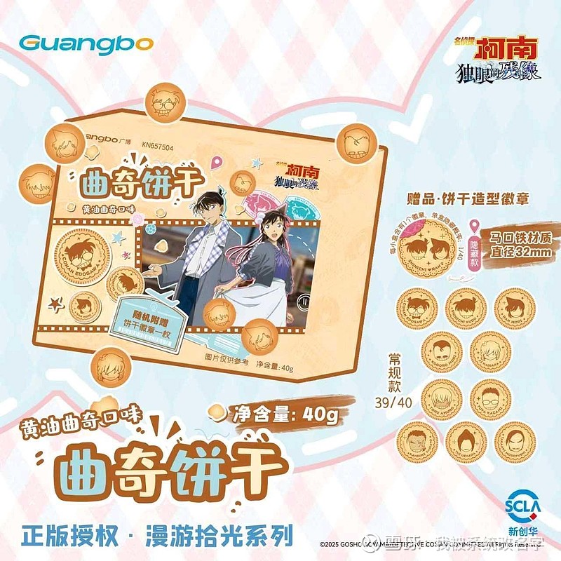 第五,食玩谷子应运而生,广博联名零食的盲盒谷子有吧唧、贴纸、立牌挂件等,买曲奇赠送的谷子,是像饼干一样的吧唧,设计得十分用心。